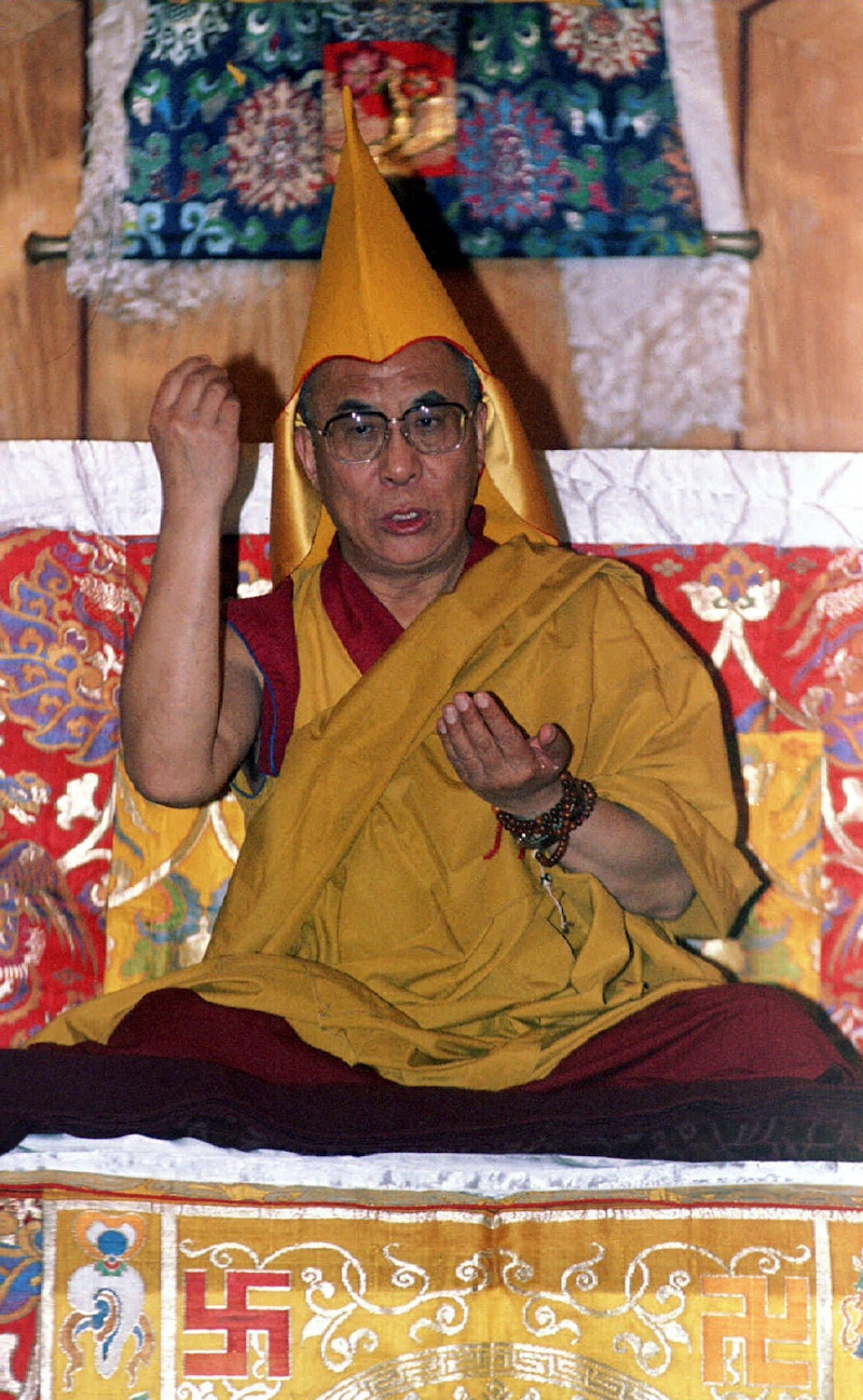 Tibetan spiritual leader and Nobel Peace Prize winner, the Dalai Lama, blesses devotees with a gesture after a traditional Buddhist prayer ceremony held on November 17 to honor his lifelong commitment to world peace.