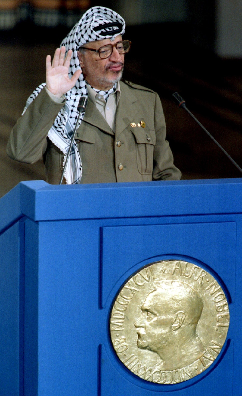 On December 10, Palestine Liberation Organization Chairman Yasser Arafat gestures while delivering his speech at the Nobel Peace Prize ceremony in Oslo City Hall.