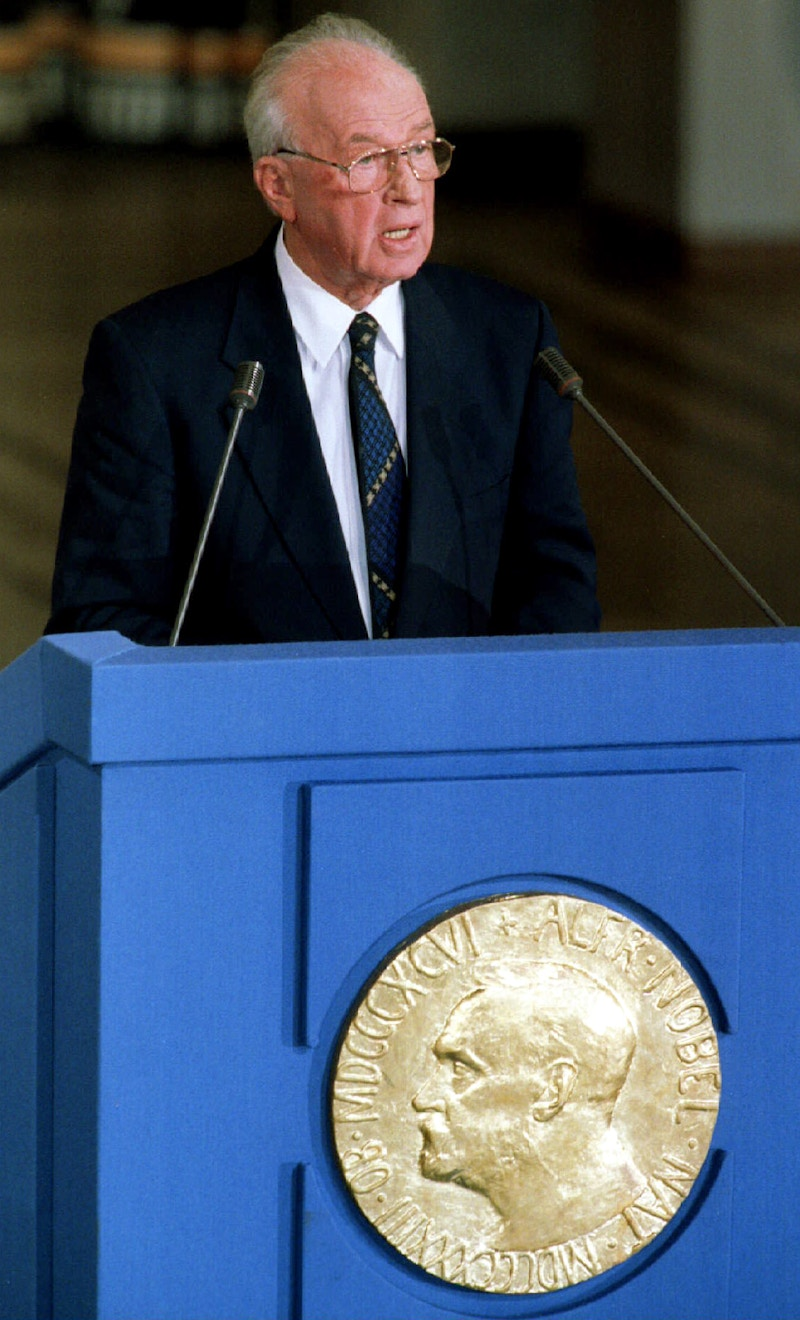 On December 10, 1994, Israeli Prime Minister Yitzhak Rabin delivers his address at the Nobel Peace Prize ceremony held in Oslo City Hall.