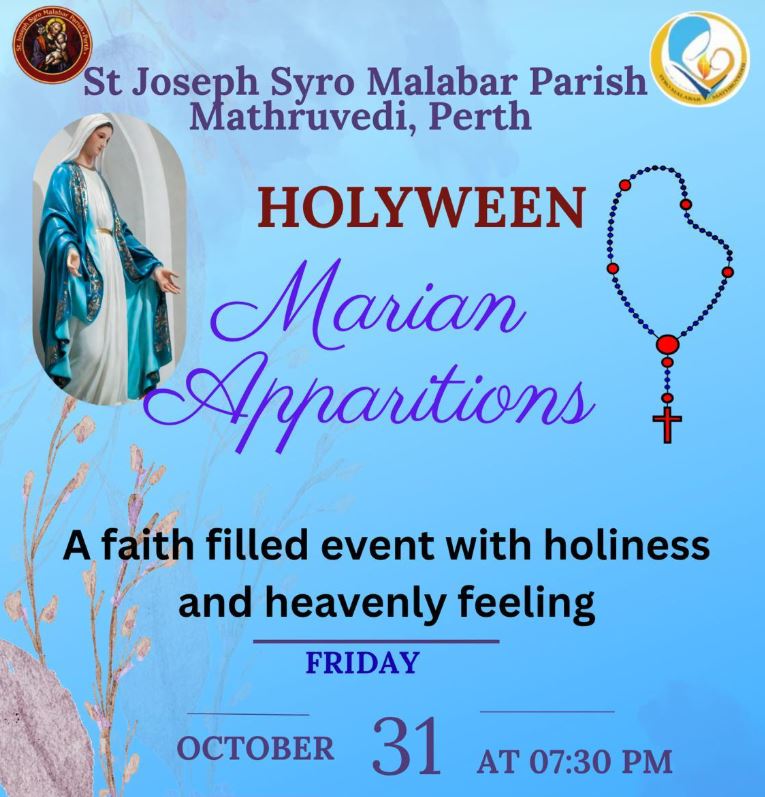 Perth: As October 31 approaches and the world turns to costumes, fright, and fantasy, the St Joseph Syro Malabar Parish in Perth is offering a powerful alternative. A unique gathering that replaces fear with faith and darkness with divine light. This year’s Holyween celebration, themed “Apparitions of Mother Mary,” will be held on Friday, October 31, 2025, from 6:00 PM to 8:00 PM, inviting families to rediscover the original spirit of All Hallows’ Eve through prayer, devotion, and reflection.