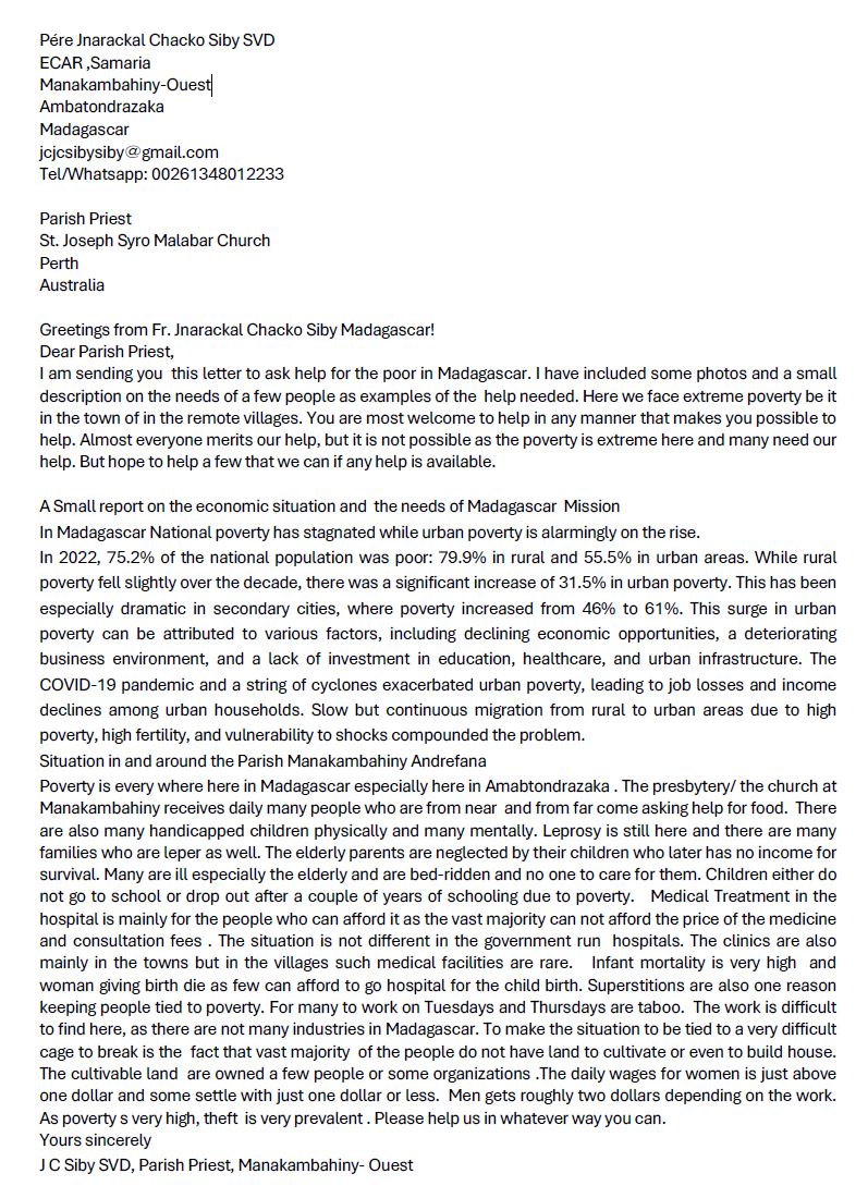 An official letter from the Parish Priest of Manakambahiny-Ouest, Madagascar, detailing the mission’s urgent needs and requesting our assistance, is also attached.