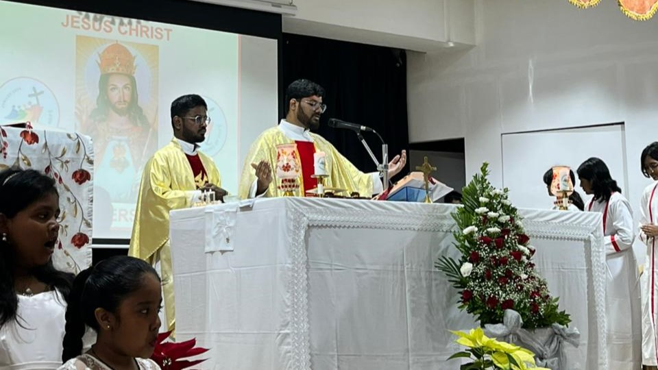 Upon entering the hall, the assembly was greeted by the powerful strains of the Jubilee Anthem, “Like a flame my hope is burning, May my soul arise to You.” This moving hymn served as the entrance song for the Holy Mass, drawing the congregation into a deeply prayerful atmosphere.