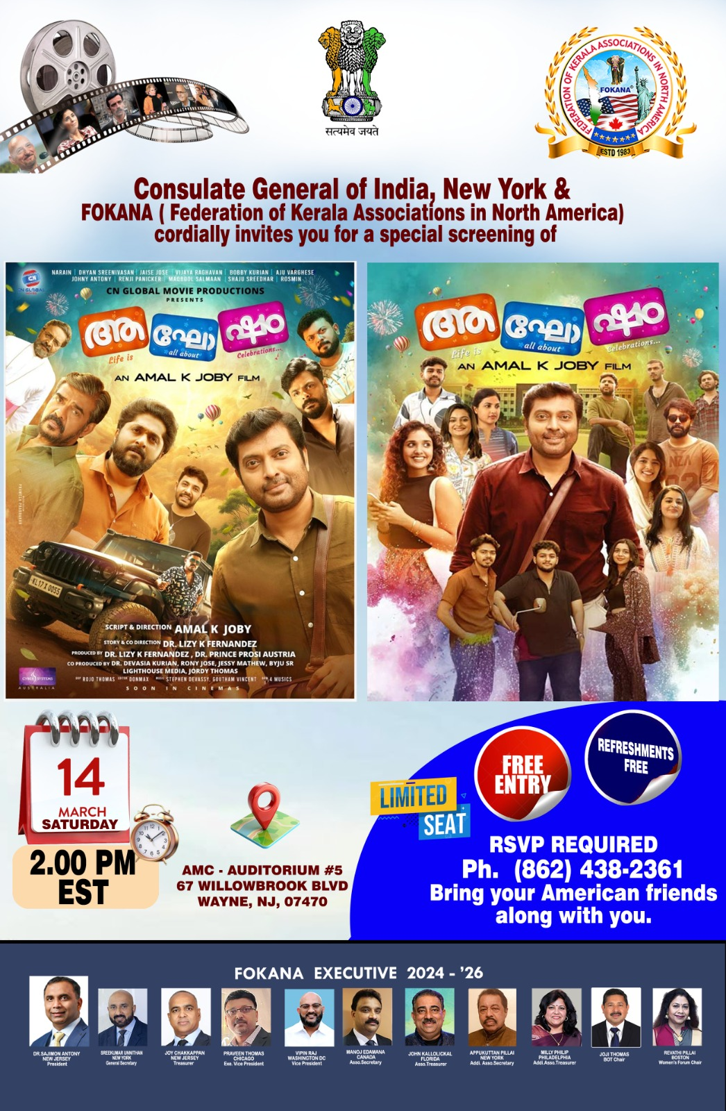 As part of this effort, the Malayalam film Aaghosham, directed by Amal K. Bobby, will be screened on March 14 at 2:00 p.m. at AMC Auditorium #7, 67 Willowbrook Boulevard, Wayne, New Jersey. The special show is being hosted under the cultural outreach initiatives of the Consulate General of India, New York in collaboration with Federation of Kerala Associations in North America, widely regarded as one of the oldest and largest organizations representing the Malayali diaspora.